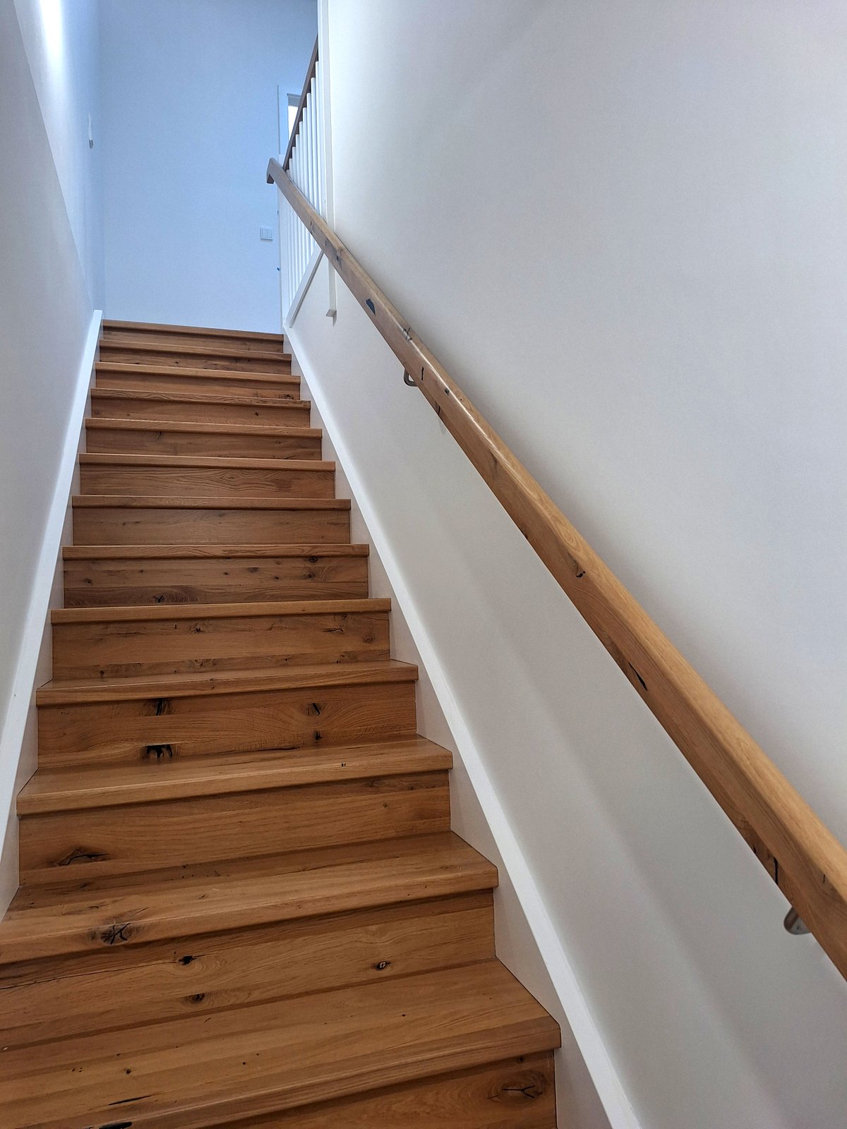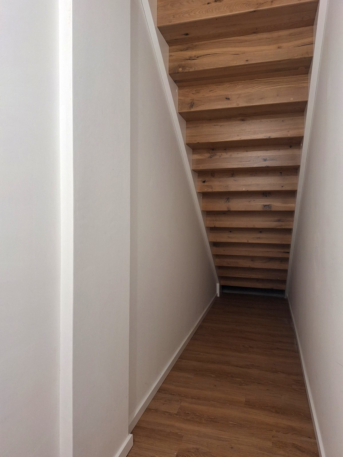 Über eine Treppe erreichen Sie die obere Etage. Diese verfügt über drei kompakte Zimmer und das Masterbad, das mit Badewanne und Dusche ausgestattet ist. Besonders schön sind die Oberlichter, die für zusätzliches Tageslicht sorgen.