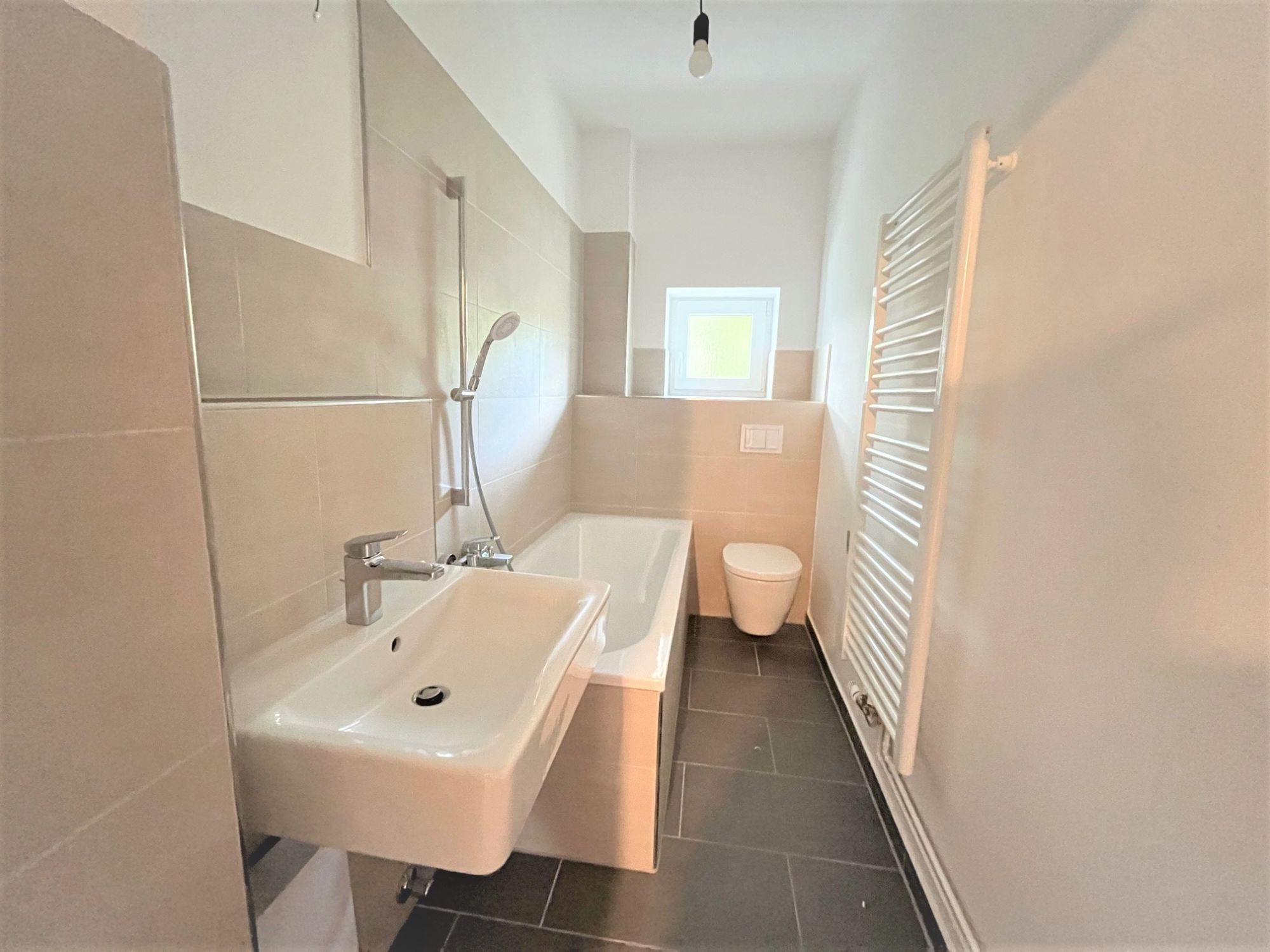 Das Tageslichtbad ist optisch ansprechend gefliest und verfügt über eine Badewanne, ein Hänge-WC sowie über einen Handtuchheizkörper.