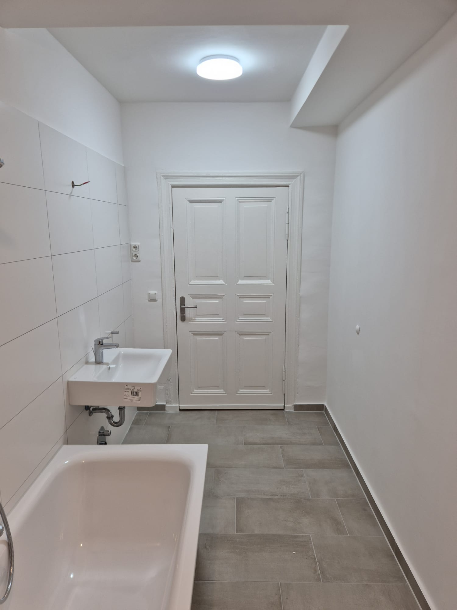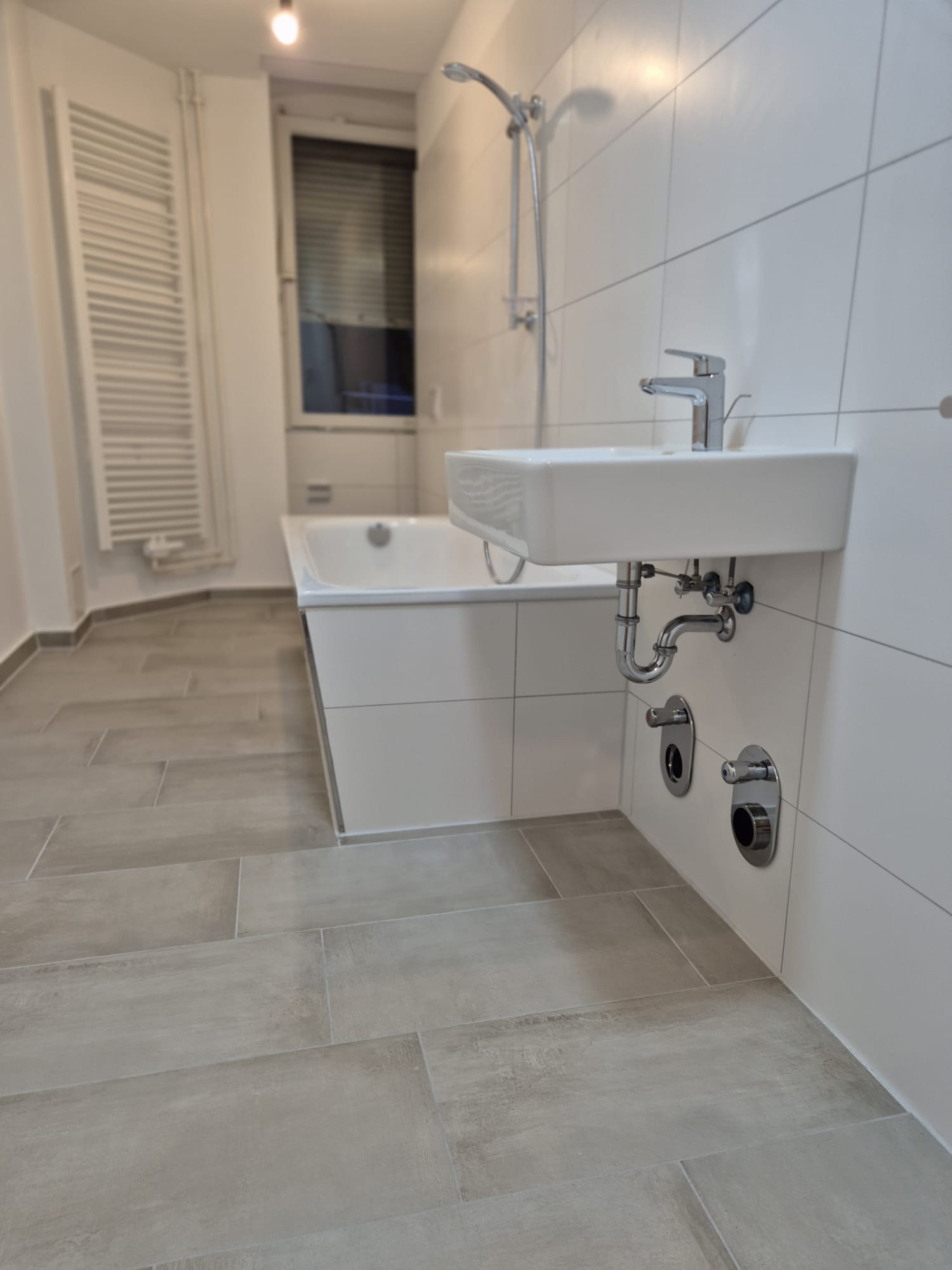 - saniertes Badezimmer mit einer Badewanne, Badewannenabtrennung, Hänge-WC, Heizkörper, neue Hebeanlage und einem Fenster