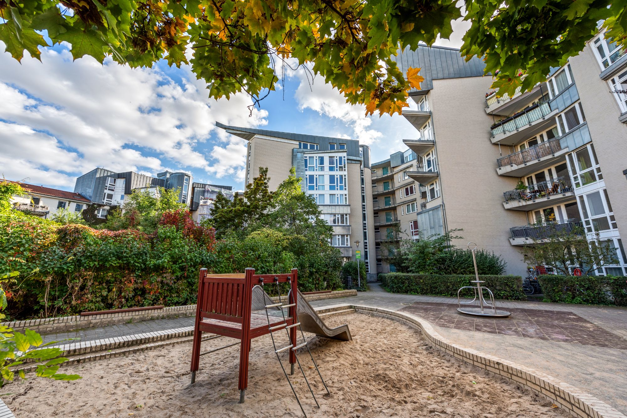 Die großzügige Außenanlage ist schön angelegt und bietet neben der Möglichkeit in der Sonne zu flanieren noch mehrere Grünanlagen mit 6 gepflegten Spielplätzen sowie weiteren Freizeitangeboten für die Mieter wie z.B. einer fest installierten Tischtennisplatte.