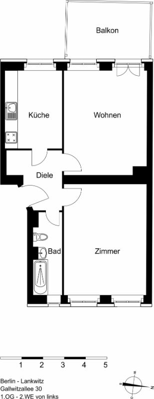 Das Schlafzimmer und das Badezimmer sind zur Straße ausgerichtet, das Wohnzimmer mit dem Balkon und die Küche sind ruhig zum Innenhof gelegen.
