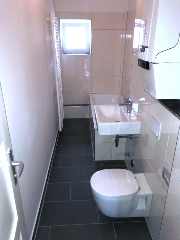 Das optisch ansprechend geflieste Tageslichtbad verfügt über eine Badewanne, einen Handtuchheizkörper sowie ein Hänge-WC.