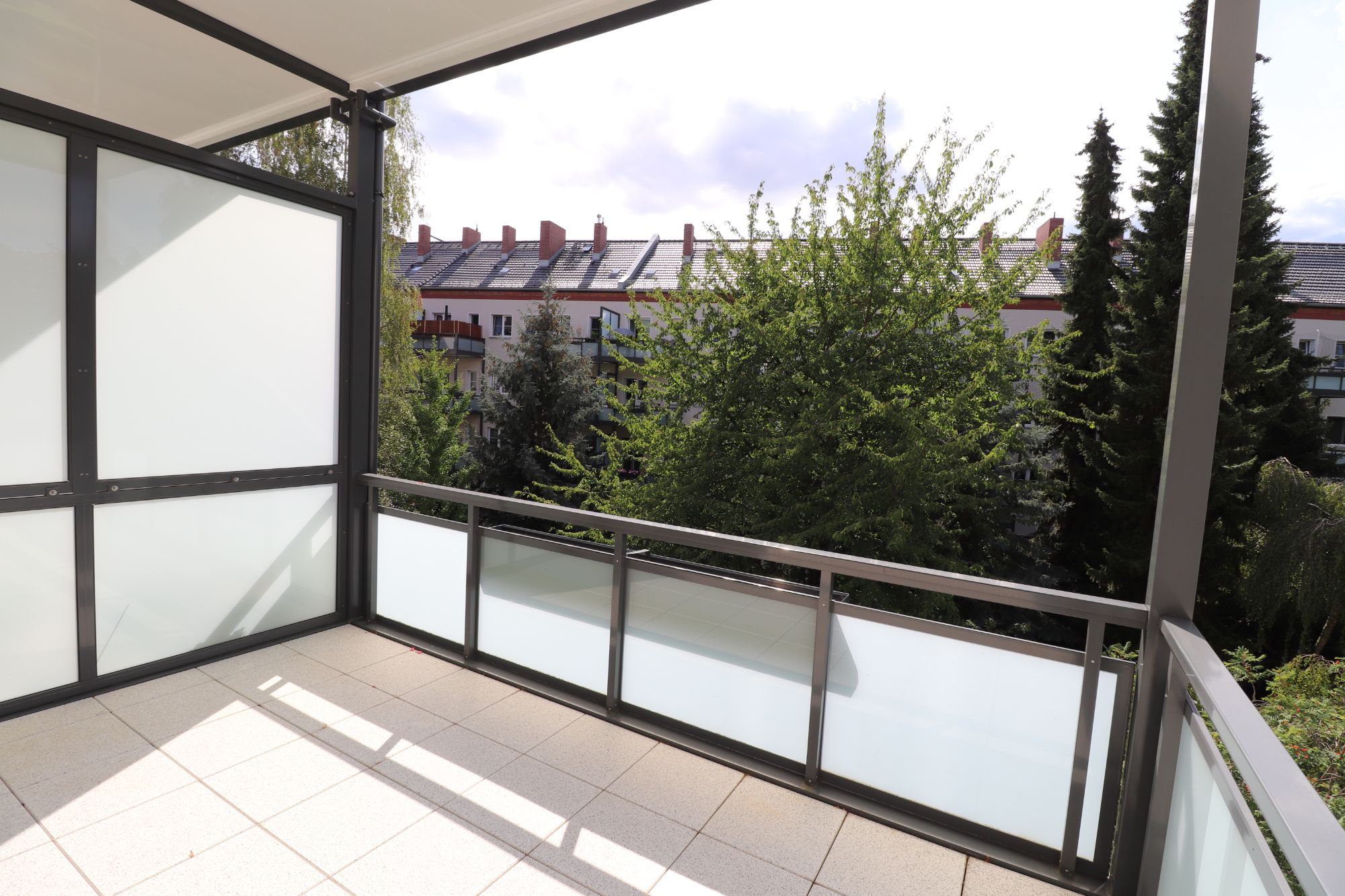 Der große Balkon, der über das Wohnzimmer begehbar ist, lädt an stressigen Tagen zum Entspannen ein.