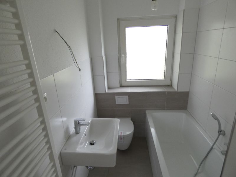 Das Bad wurde komplett erneuert und mit modernen Fliesen ausgestattet.