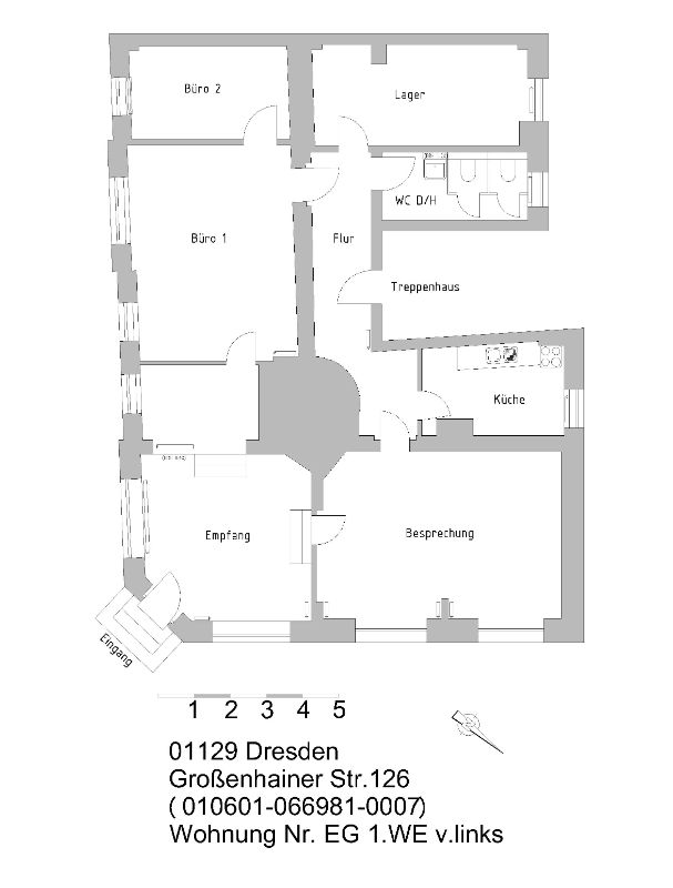 Die Raumaufteilung entnehmen Sie dem beigefügten Grundriss. Diese besondere und großzügige Gewerbefläche eignet sich beispielsweise für eine Praxis- oder Büronutzung.