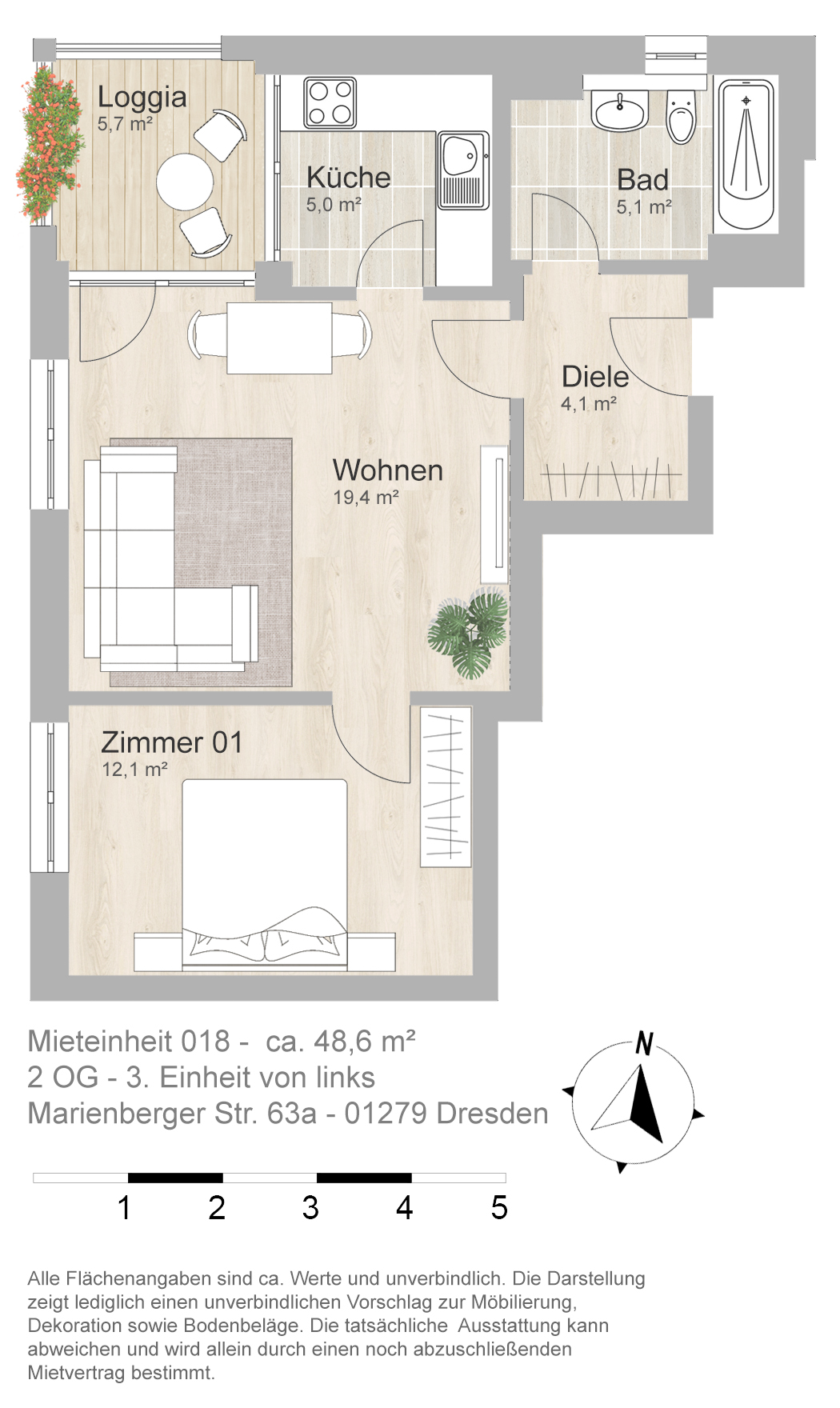 Die Marienberger Str. 63-63e besteht aus 5 einzelnen Häusern und bildet zusammen mit der Kipsdorfer Str. 176-190 einen Siedlungsbereich. Die Wohnhäuser wurden im Jahr 1996 erbaut und auf 4 Vollgeschossen befinden sich insgesamt 66 Wohnungen. Ein Keller mit mehreren Mieterabteilen ist vorhanden. Der Außenbereich ist großflächig begrünt und die Zuwegungen sind gepflastert. Der Außenbereich wird zusammen von allen Häusern. Die Häuser sind eingezäunt und besitzen separate Zugänge. Die Versorgung mit Wärme und Warmwasser erfolgt zentral. Wesentlicher Energieträger ist Fernwärme.