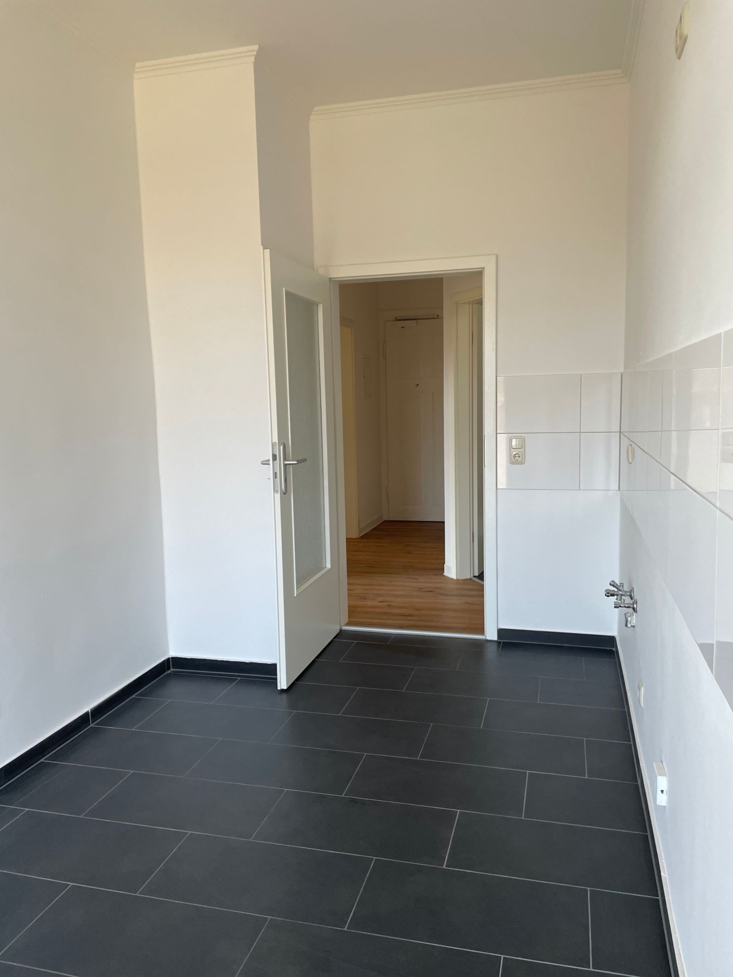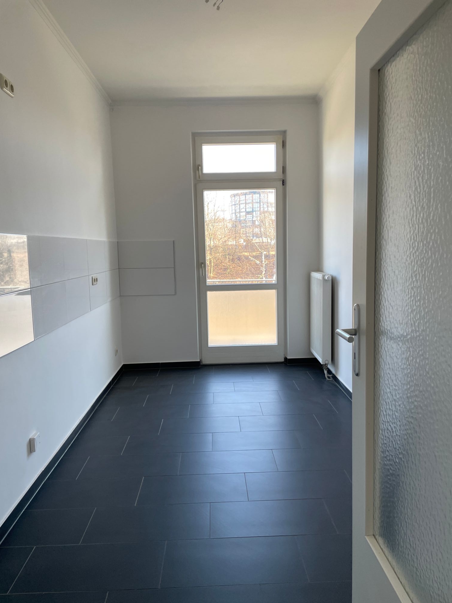 - geflieste Küche mit modernem Fliesenspiegel und Zugang zum Balkon (Nordostausrichtung)