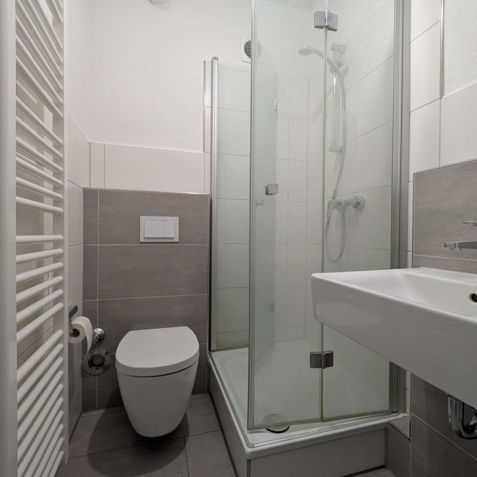 Das Duschbad ist gefliest und verfügt über ein WC, einen Waschtisch sowie eine Duschabtrennung.