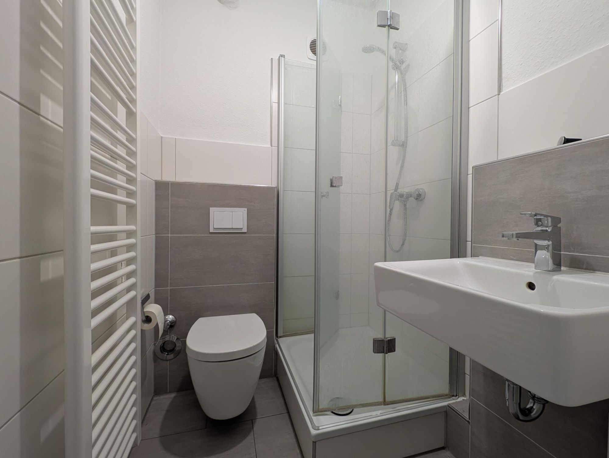 Das Duschbad ist gefliest und verfügt über ein WC, einen Waschtisch sowie eine Duschabtrennung.