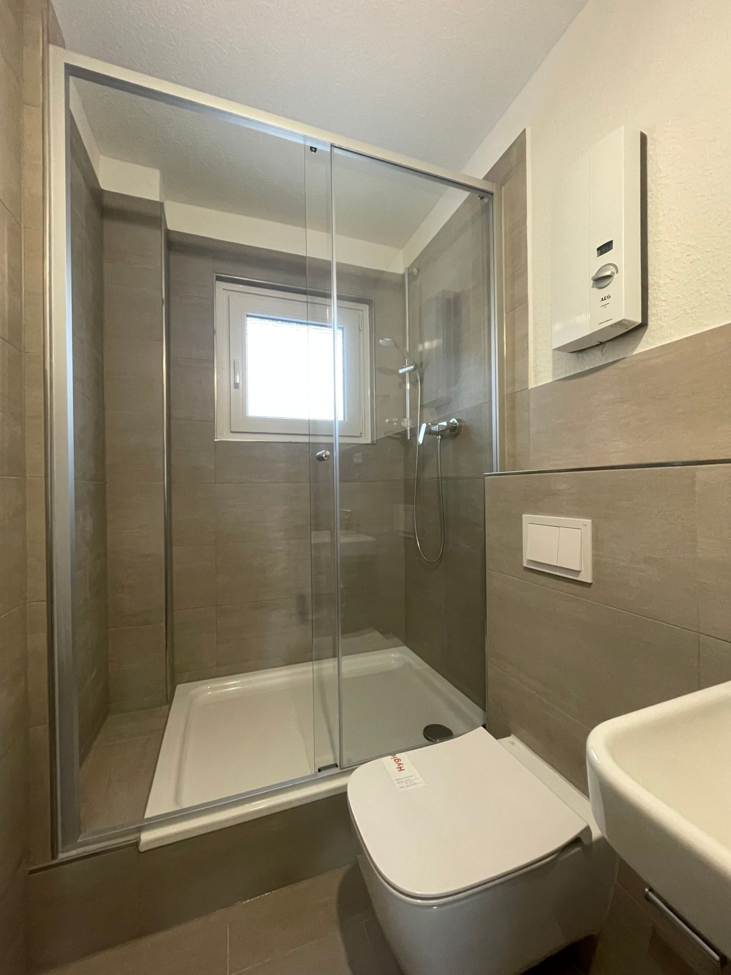 - Premiumbad: Dusche mit Glaskabine, Hänge WC, Waschbecken,