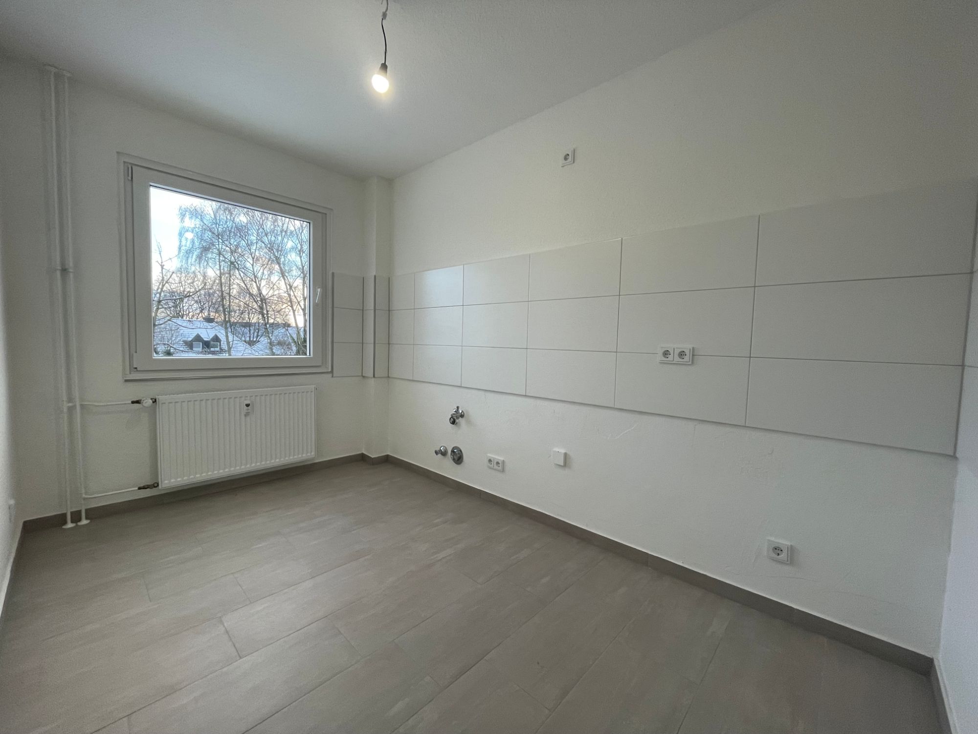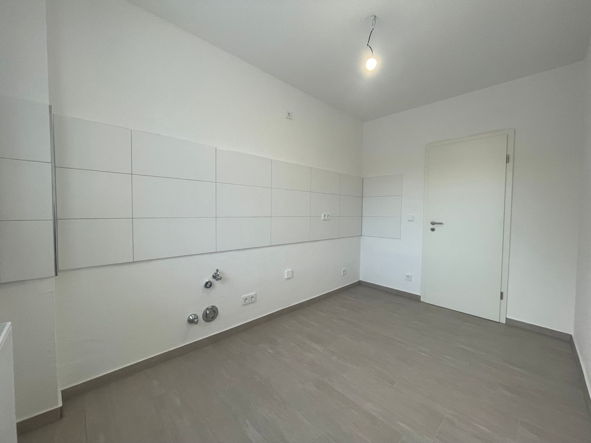 - Küche: graue Bodenfliesen, weißer Fliesenspiegel, Format 30 cm x 60 cm