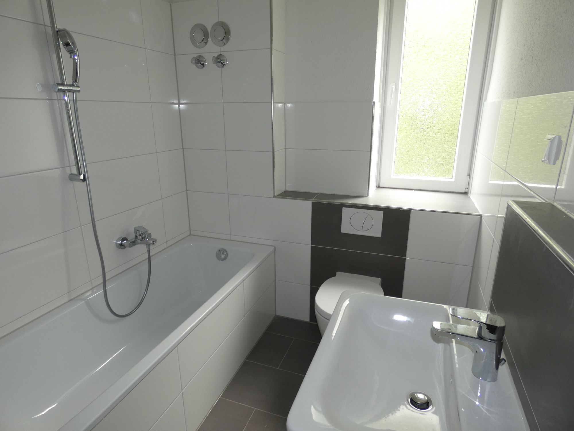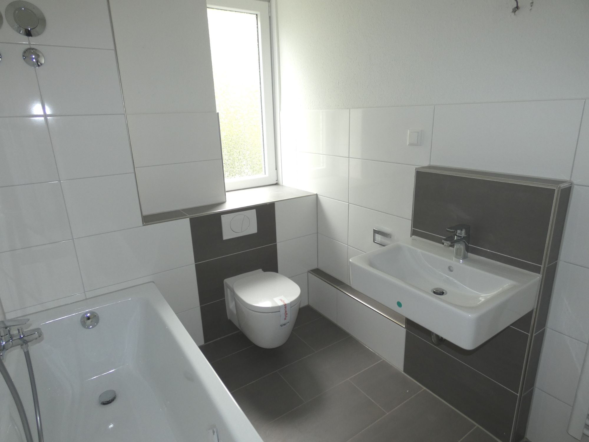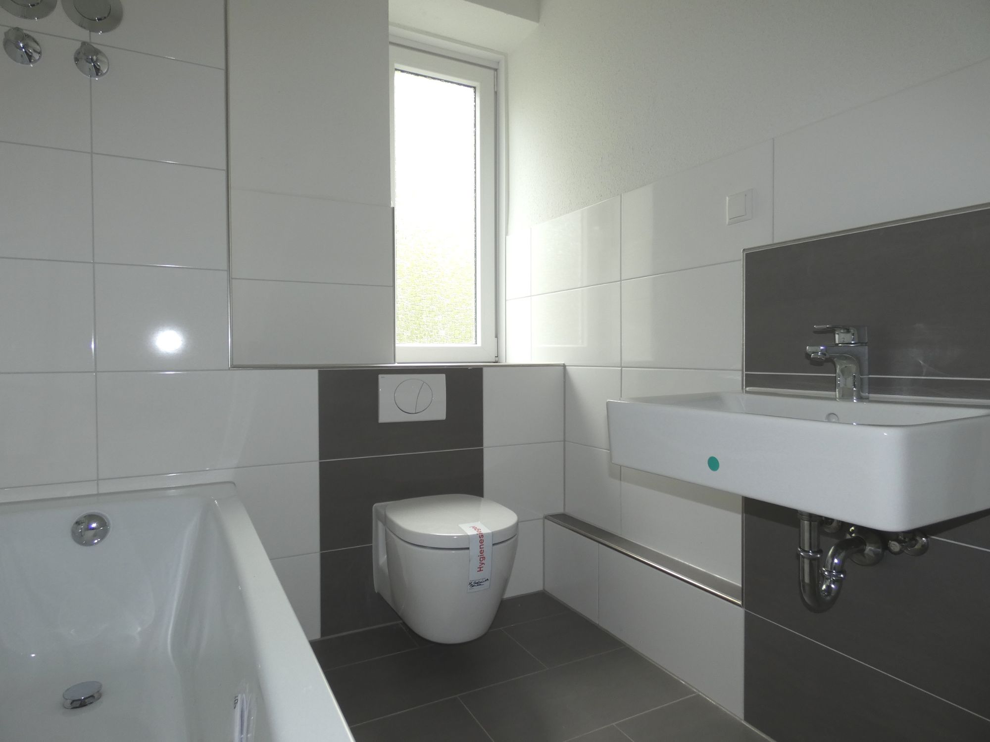 - Premium-Bad-Ausstattung: Handtuchheizkörper, Wanne, Wand-WC mit