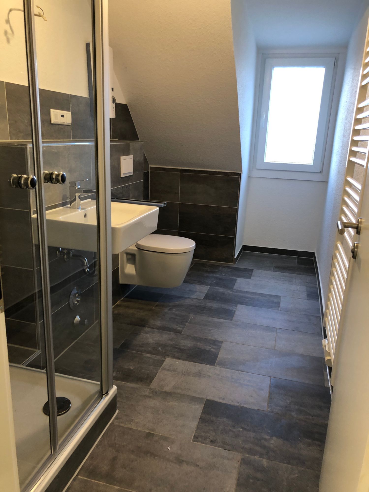 - moderne Wand- und Bodenfliesen (Format 30x60cm) im Bad