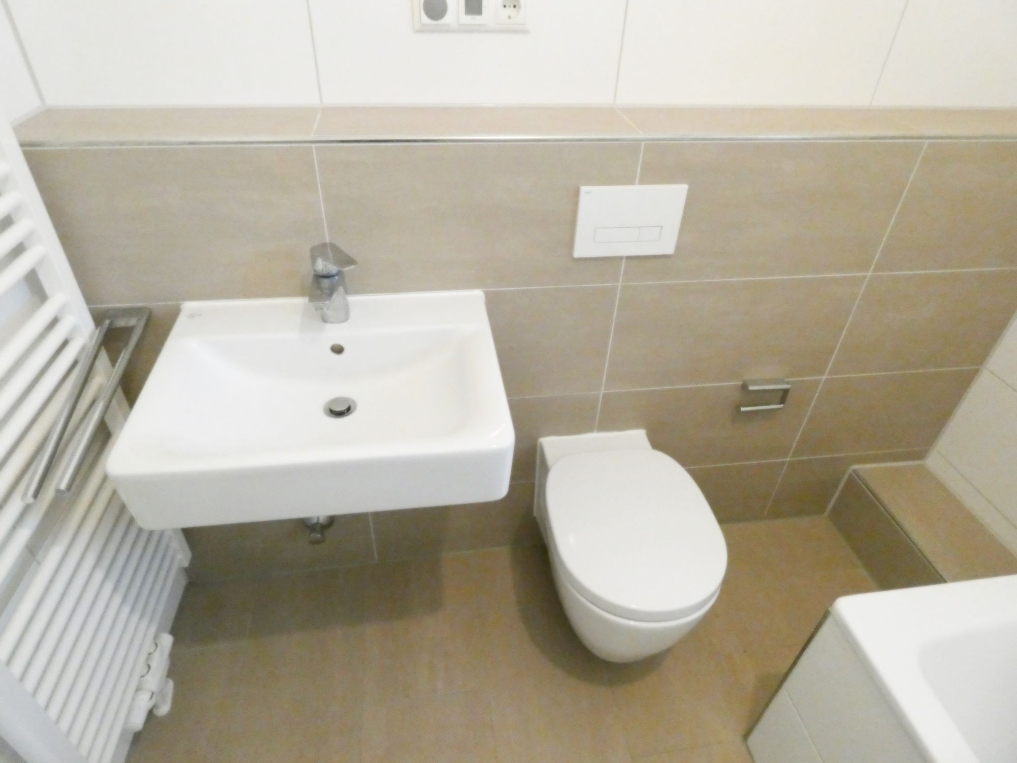 - tolles Tageslichtbad mit Handtuchheizkörper, Badewanne (Duschabtrennung aus Glas), Wand-WC mit Vorwandinstallation, modernem Handwaschbecken und hochwertigen Sanitärausstattung, Waschmaschinenanschluss