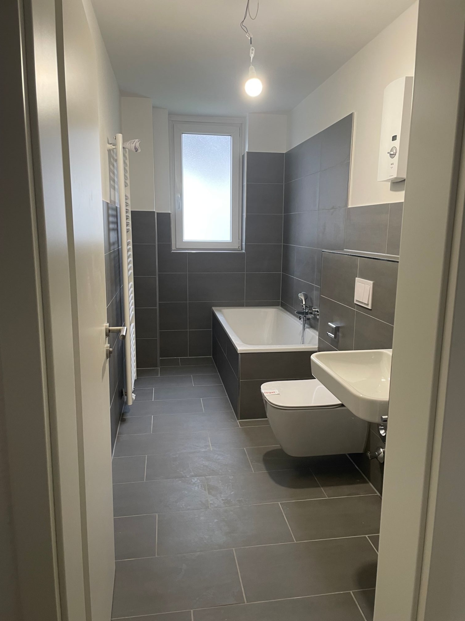 Im Zuge der Modernisierung wird das Tageslichtbad vollständig erneuert. Dieses überzeugt künftig mit einer Badewanne inklusive moderner Glas-Duschabtrennung, hochwertiger Sanitärausstattung, einer Handtuchheizung sowie zeitlosen Boden- und Wandfliesen im Format 30 x 60 cm in einem modernen Mittelgrau. Die Küche erhält dieselbe Bodenfliese und sorgt so für ein stimmiges Gesamtbild.