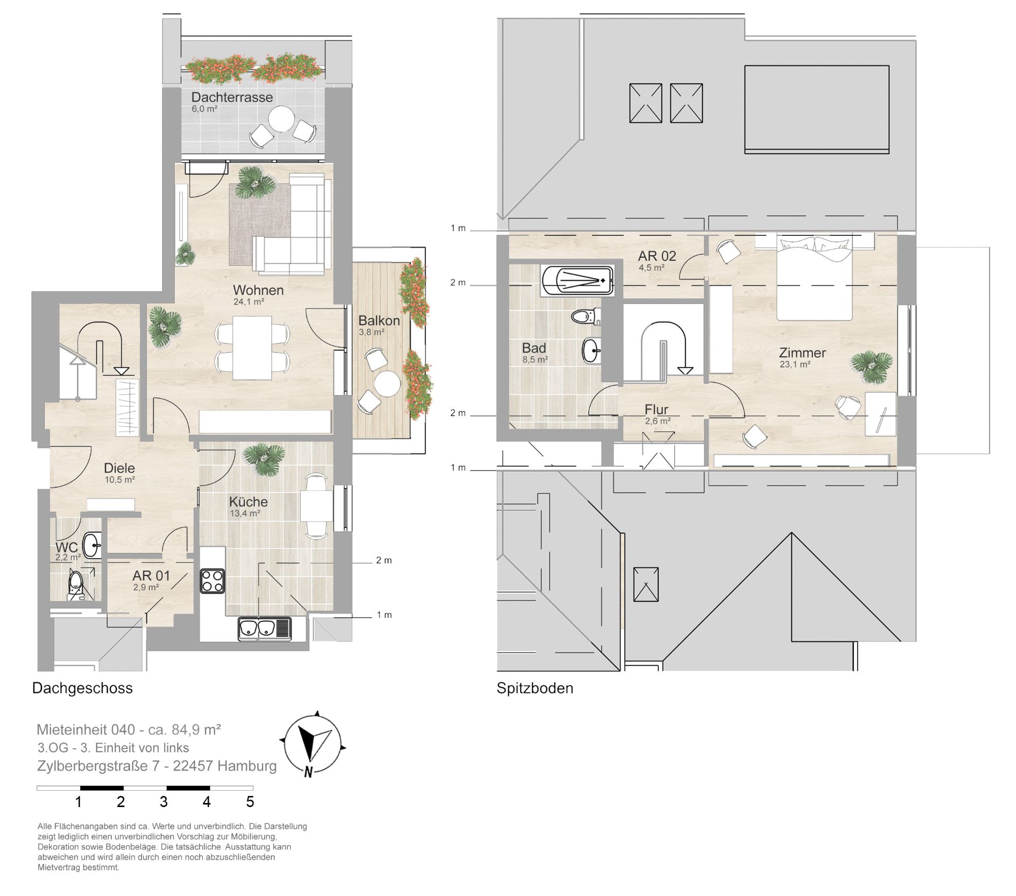 Die Wohnanlage besteht aus insgesamt 76 Wohneinheiten, 53 Parkplätzen und 17 Stellplätze in einer Tiefgarage. Mit optimalen Wohnungsgrößen von 57 bis 94 m² sind die Wohnungen sowohl für Singles als auch für Familien geeignet. Innerhalb der Anlage steht den kleinen Mitbewohnern ein Spielplatz mit Spielgeräten und einem großen Sandkasten zur Verfügung.