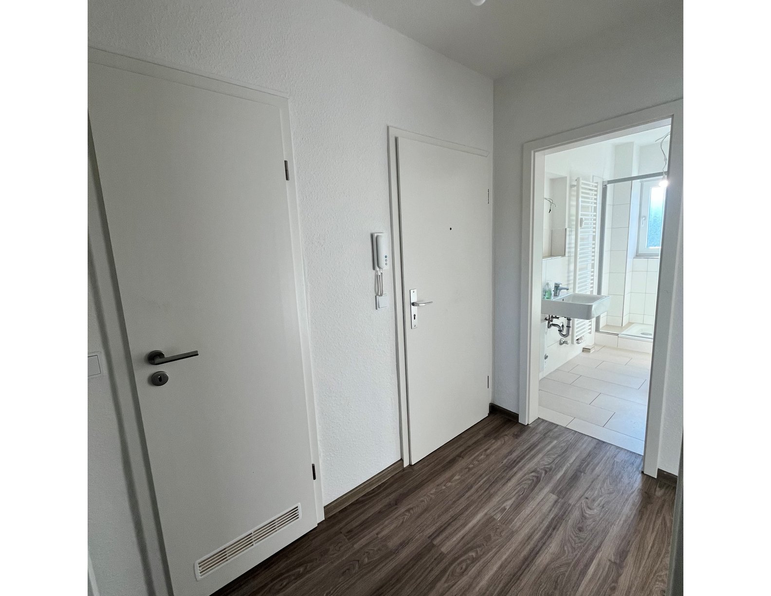 Die Wohnung verfügt über einen hochwertigen Designboden in Holzoptik, der in allen Wohn- und Schlafbereichen eine warme und moderne Atmosphäre schafft. Die Wände sind mit weißer Raufasertapete versehen und bieten eine neutrale Grundlage für individuelle Gestaltung.