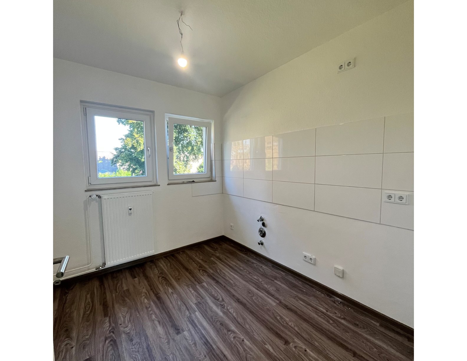 Der separate Küchenbereich ist mit einem zeitlosen Fliesenspiegel ausgestattet und bietet Platz für eine Einbauküche nach eigenen Vorstellungen.